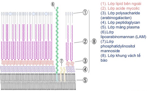 – Lớp giữa gọi là peptidoglycan được xem là màng polyme sinh học. Chúng liên kết với đường arabinose và các phân tử acid mycolic cấu tạo bộ khung định hình, đảm bảo cho vỏ trực khuẩn lao có độ cứng chắc chắn.
