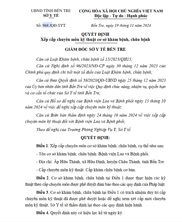 Quyết định xếp cấp chuyên môn kỹ thuật cơ sở khám bệnh, chữa bệnh